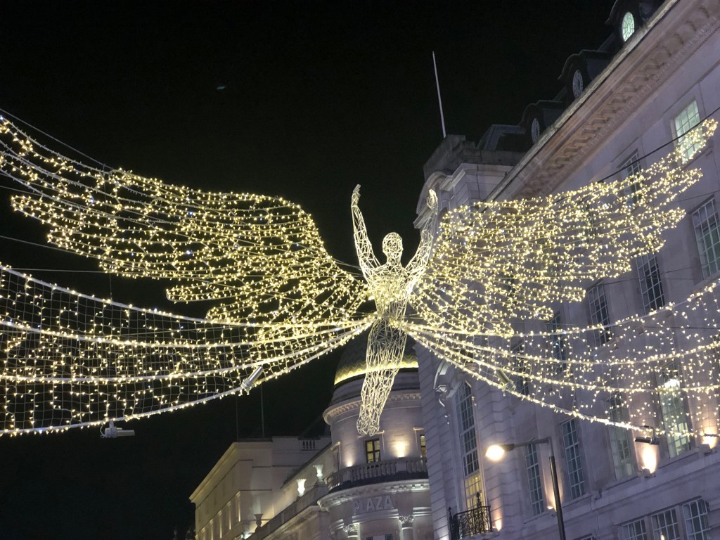 Although London is too large a city to have a cozy, Christmas feeling, it puts Paris to shame in terms of festive cheer. The trick to London is to carefully plot your holiday tour. There are wonderful Christmas scenes, but you don’t run into them on every street. For instance, Covent Garden was spectacular with trees, lights and beautiful displays, such as the one sponsored by Tiffany & Co. A short walk away brings you to the iconic iceskating rink at Somerset House where the posh department store, Fortnum and Mason, hosted a pop-up dining and shopping area. According to their website, “Take a stroll down the Christmas Arcade for a little piece of Piccadilly and visit the Fortnum’s Lodge for Mince Pies, Fondues for Two, Hot Chocolate, Champagne, and more.” Yummy. Speaking of Piccadilly, head over there after dark for inspired Christmas lights soaring above the city.